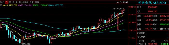 大妈抄底成功。 在通胀预期升温等因素推动下,国际金价进一步走高,黄金现货价格盘中已经突破1910美元/盎司,相比2个月前的低点1673.3美元/盎司,反弹超过200美元/盎司。与此同时COMEX黄金期货也站稳1900美元/盎司,创下近5个月新高。