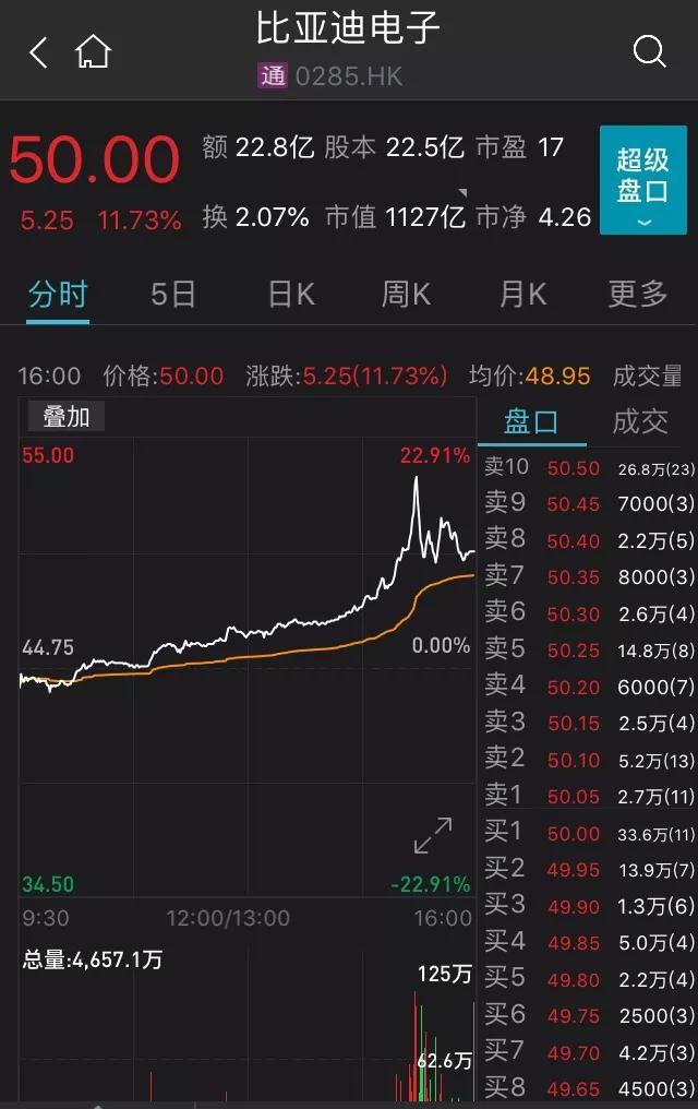 在港上市的比亚迪电子下午3点过后一波急速拉升,一度大涨超22%,截至收盘涨幅回落至11.73%。