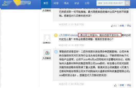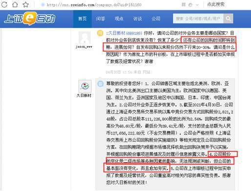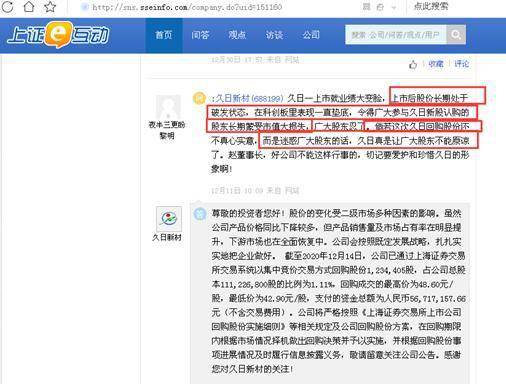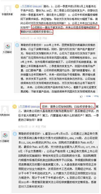 有投资者在2020年12月11日在上证e互动上“控诉”,“久日一上市就业绩大变脸,上市后股价长期处于破发状态,在科创板里表现一直垫底,令得广大参与久日新股认购的股东长期蒙受市值大损失,广大股东忍了。倘若这次久日回购股份还不真心实意,而是迷惑广大股东的话,久日真是让广大股东不能原谅了。赵董事长,好公司不能这样行事的,切记要爱护和珍惜久日的形象啊!”