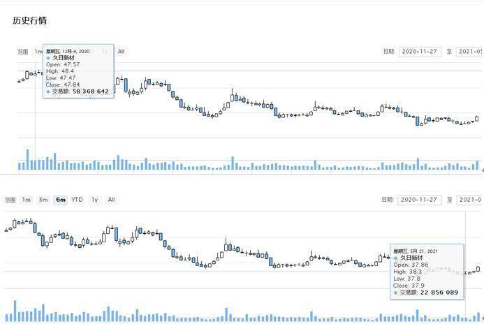结果,单单投资者对股价“上涨的期望”就被现实“打脸”。2020年12月4日,即本次回购的首次实施,久日新材当天的收盘价为47.84元/股,2021年5月22日(周六)即本次回购期届满的最后一个交易日,即2021年5月21日当天久日新材的收盘价为37.9元/股,即从回购开始日至届满,久日新材股价整体下跌20.78%。