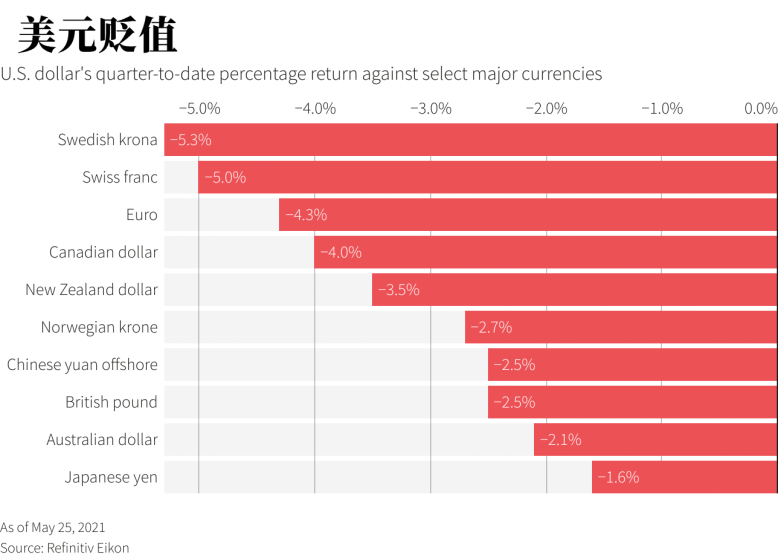 美元指数成为本季度迄今为止全球主要货币中表现最差的货币,较3月底的峰值下跌了4%。相比之下,二季度以来,欧元兑美元升值4%,巴西雷亚尔升值6%,人民币升值约3%。