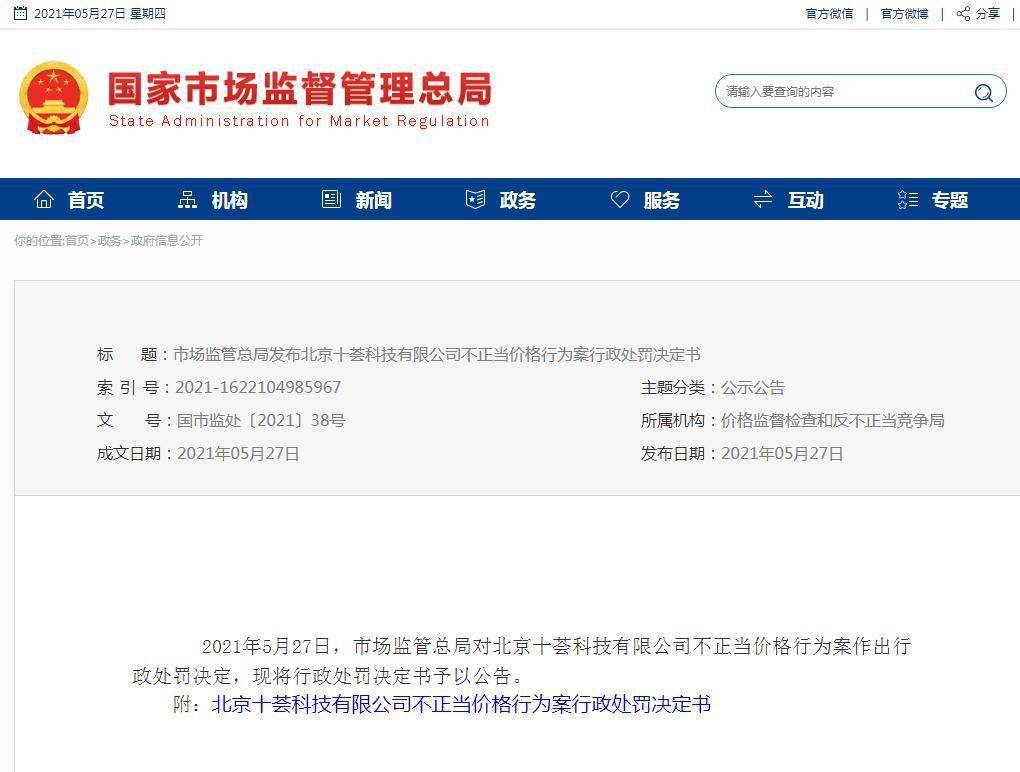 5月27日消息 今日,市场监管总局对北京十荟科技有限公司不正当价格行为案作出行政处罚决定,合计罚款达150万。
