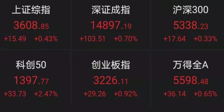 今天,上证指数收涨0.43%,录得四连阳,收3608.85。创业板指涨0.92%。