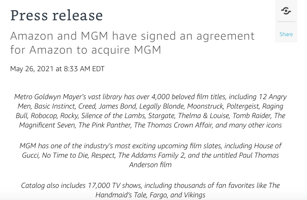 据报道,亚马逊Prime Video和亚马逊工作室高级副总裁迈克·霍普金斯(Mike Hopkins)在一份声明中称:“这笔交易背后的真正经济价值是,获得米高梅大量影视节目的IP宝库。我们将重新策划,并与米高梅的人才团队一起开发这些IP。这笔交易非常令人兴奋,为将来制作高质量的内容提供了大量机会。”