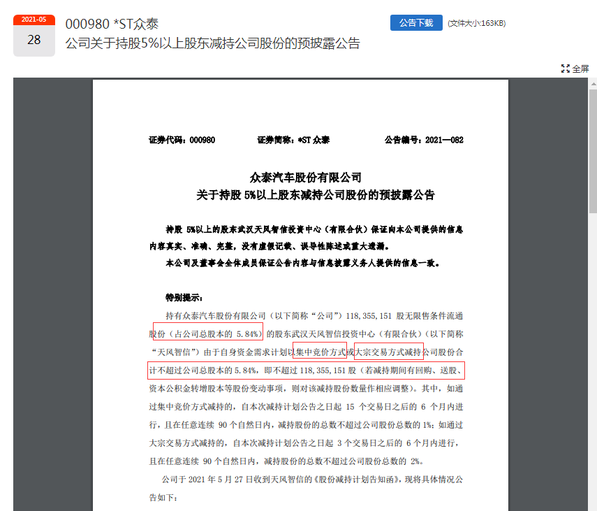 5月27日晚间,*ST众泰发布公告称,公司持股5.84%的股东武汉天风智信投资中心(有限合伙)计划以集中竞价方式或大宗交易方式,减持公司股份合计不超过公司总股本的5.84%,即不超过1.18亿股。