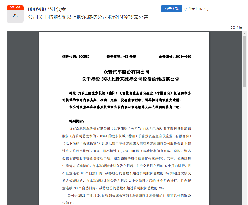 值得注意的是,5月25日,*ST众泰发布公告称,持有众泰汽车股份有限公司142,617,508股无限售条件流通股份(占公司总股本的7.03%)的股东长城(德阳)长富投资基金合伙企业(有限合伙)计划以集中竞价方式或大宗交易方式减持公司股份合计不超过公司总股本比例2.03%,即不超过41,234,000股(若减持期间有回购、送股、资本公积金转增股本等股份变动事项,则对该减持股份数量作相应调整)。