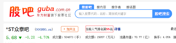 消息一出,*ST众泰股吧里瞬间炸锅了,人气急剧飙升,当前人气排行第55名。