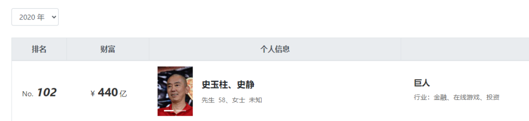 这期间,史玉柱赴上海再度创业,由其一手创办的“新巨人”——巨人网络集团股份有限公司也成功上市。在2020福布斯中国400富豪榜上,史玉柱排名第390位,财富值107.4亿元。而根据2020年胡润百富榜,史玉柱和史静以440亿元财富排在第102位。