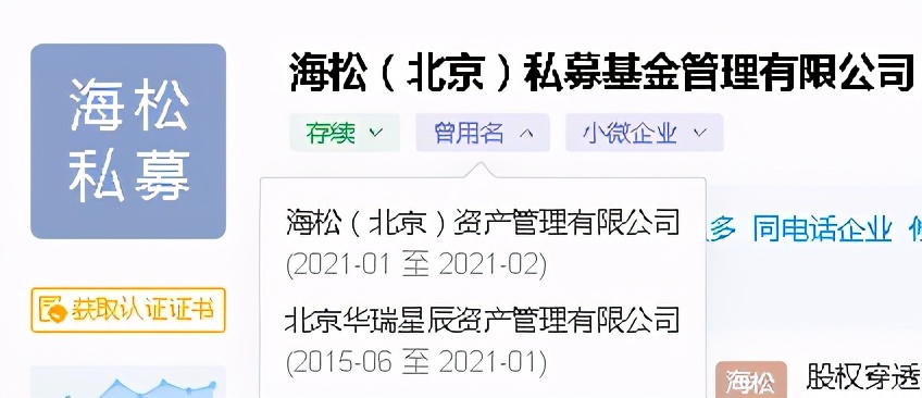 天眼查显示,北京华瑞星辰资产为海松(北京)私募基金管理有限公司的曾用名。华瑞星辰资产成立于2015年4月,注册资本3000万人民币。成立之初,法定代表人为王伟,2017年8月法人变更为现在的王雷,2021年1月,企业名称变更为海松(北京)资产管理,不久后变更为海松(北京)私募基金管理有限公司。