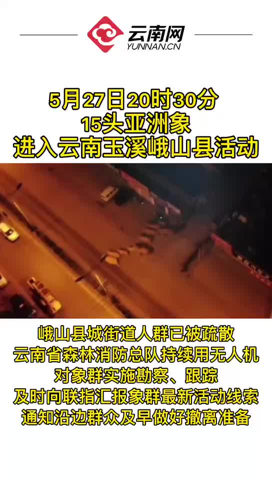 5月27日18时30分至19时20分,野象群由大坟山附近向西北方向移动。20时30分,野象群通过峨山县城熠峨路,目前在峨山县城熠峨路和昆磨高速民房附近徘徊。峨山县城街道人群已被疏散,云南省森林消防总队持续用无人机对象群实施勘察、跟踪,及时向联指汇报象群最新活动线索,通知沿边群众及早做好撤离准备。