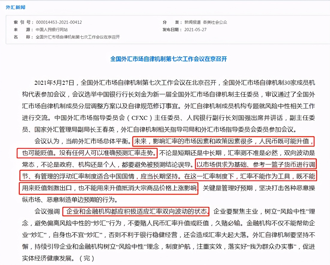 近期,针对人民币汇率波动,国务院金融稳定发展委员会(下称“金融委”)和中国人民银行先后发声。5月27日,全国外汇市场自律机制第七次工作会议在京召开,全国外汇市场自律机制30家成员机构代表参加会议,并就汇率风险中性相关工作进行交流。