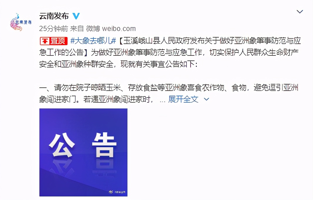 刚刚,据云南发布微博,玉溪峨山县人民政府发布关于做好亚洲象肇事防范与应急工作的公告。指出,为做好亚洲象肇事防范与应急工作,切实保护人民群众生命财产安全和亚洲象种群安全,现就有关事宜公告如下: