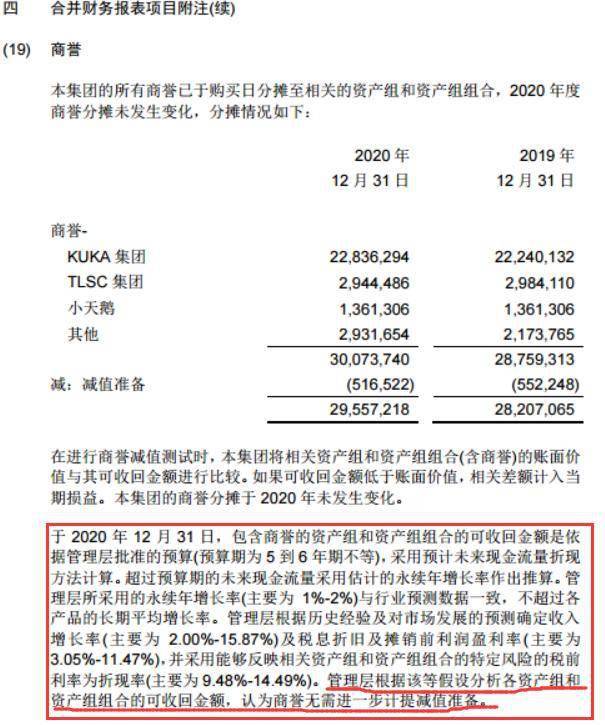 较低的假设门槛在一定程度上保护住了库卡的商誉,因此美的在年报中写明:管理层根据该等假设分析各资产组和资产组组合的可收回金额,认为商誉无需进一步计提减值准备。