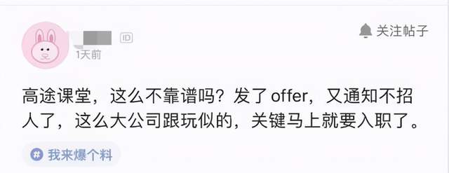 与之对应的是脉脉上的爆料。一位脉脉用户日前发布了消息:‘高途课堂,这么不靠谱吗?发了offer,又通知不招人了’,其评论区有数条回应表示遇到了类似问题。另一位脉脉用户透露:“高途课堂hc冻结了,应届生offer几乎算是被收回了”。