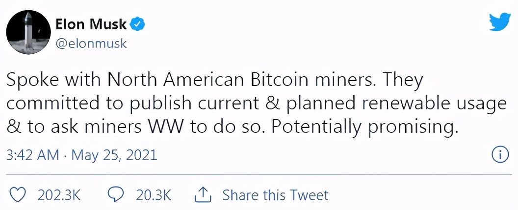 本周一马斯克的一条推特可能也暗示了类似的信号。马斯克周一在推特中写道:“我和北美比特币矿工们进行了交谈,他们承诺将会公开当前和计划中的可再生能源使用情况,并要求全球矿工都这么做。这可能有希望。”