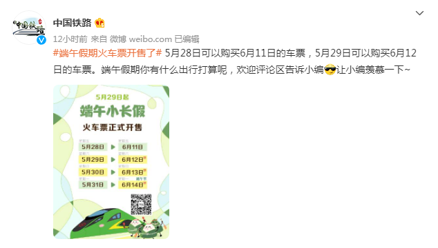 据“中国铁路”官方微博,5月28日可以购买6月11日的车票,5月29日可以购买6月12日的车票。