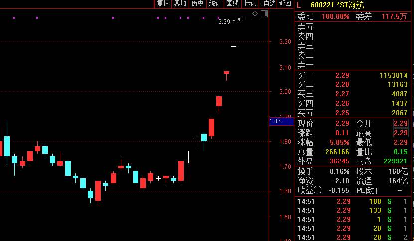 二级市场上,自5月18日起,*ST海航近9个交易日,揽获7个涨停。现价2.29元/股,最新市值逾380亿元。