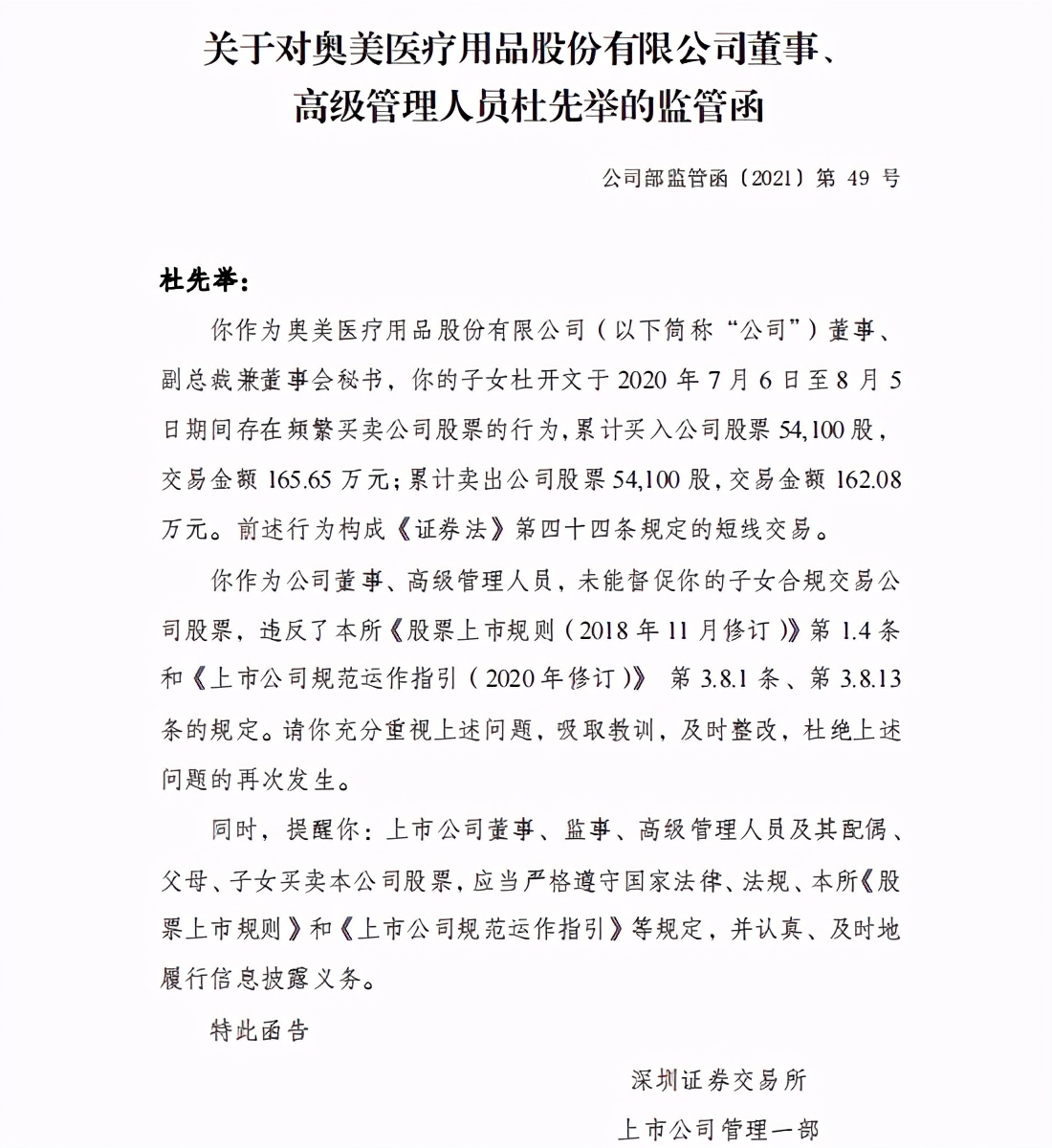5月29日,奥美医疗(0002950,SZ)董事、副总裁兼董事会秘书杜先举收到一张来自深交所的监管函。