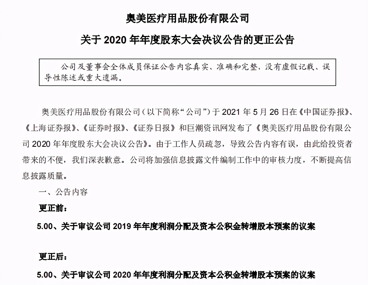 有意思的是,5月26日,奥美医疗发布了《奥美医疗用品股份有限公司2020年年度股东大会决议公告》,把《关于审议公司2020年年度利润分配及资本公积金转增股本预案的议案》中的“2020年”,错写成“2019年”,玩起了穿越。