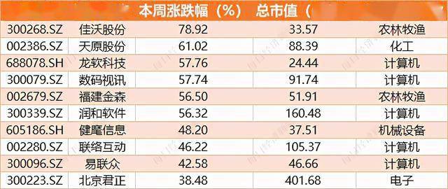 同样刨去刚上市交易的次新股、ST/*ST股和即将退市股不计,牛眼君(每经牛眼:njcjnews)统计发现,本周涨幅最高的是 佳沃股份,本周实现5连阳,累计涨幅达79%,包括昨日的一个“20cm 大号”涨停。
