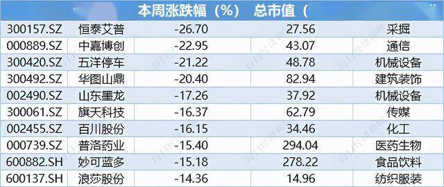 本周跌幅最大的是恒泰艾普,周内跌幅近27%。恒泰艾普23日公告称,或因发行股票涉及控制权变更,自5月24日起停牌,之前自4月29日起累计最高涨幅逾70%。24日晚,恒泰艾普披露向特定对象发行股票预案,本次发行对象为山西山能发电有限公司,发行价格为3.39元/股,募集资金总额不超过7.24亿元。不过25日复牌后市场并不买账,当天即吃了个“20cm大号”跌停。