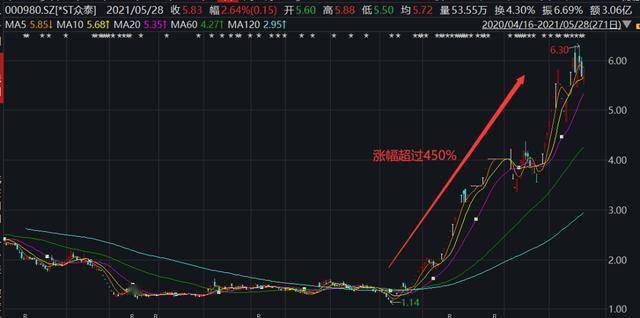 今年的大妖股非*ST众泰莫属,从年初的1.14元一路狂飙至6.3元新高,涨幅超过450%。