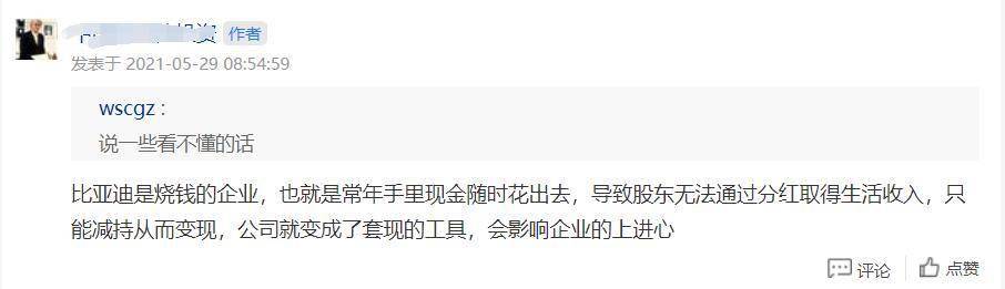 还有网友表示, 比亚迪的股东无法通过分红来取得生活收入,只能通过减持变现。