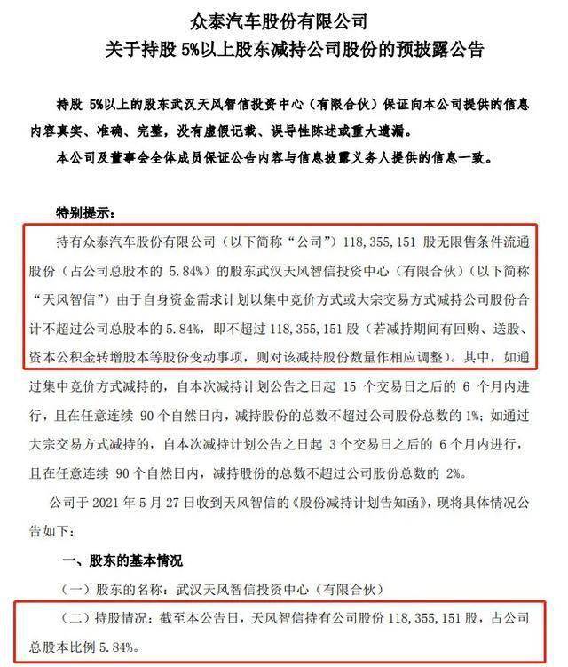 5月27日,*ST众泰公告称,公司第三 大股东天风智信,由于自身资金需求计划以集中竞价方式或大宗交易方式减持公司股份合计不超过公司总股本的5.84%,即不超过1.18亿股。