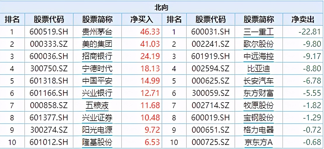 个股方面,从近7天北向资金十大活跃个股成交及资金流向角度看,贵州茅台净买入额46.33亿元居首,美的集团和招商银行净买入额分别为41.03亿元和24.19亿元位列二三。