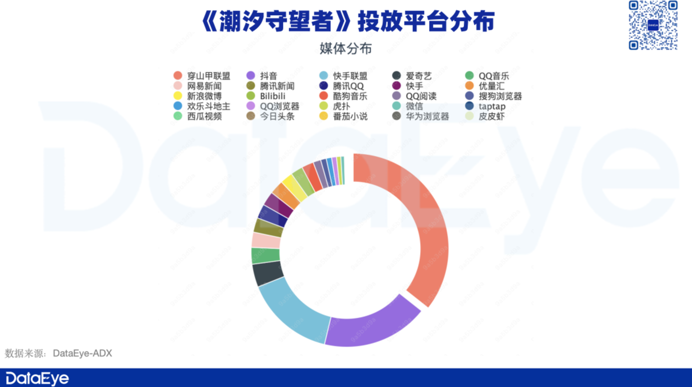 DataEye-ADX数据显示,《潮汐守望者》投放媒体渠道TOP3分别是穿山甲联盟、抖音、快手联盟。