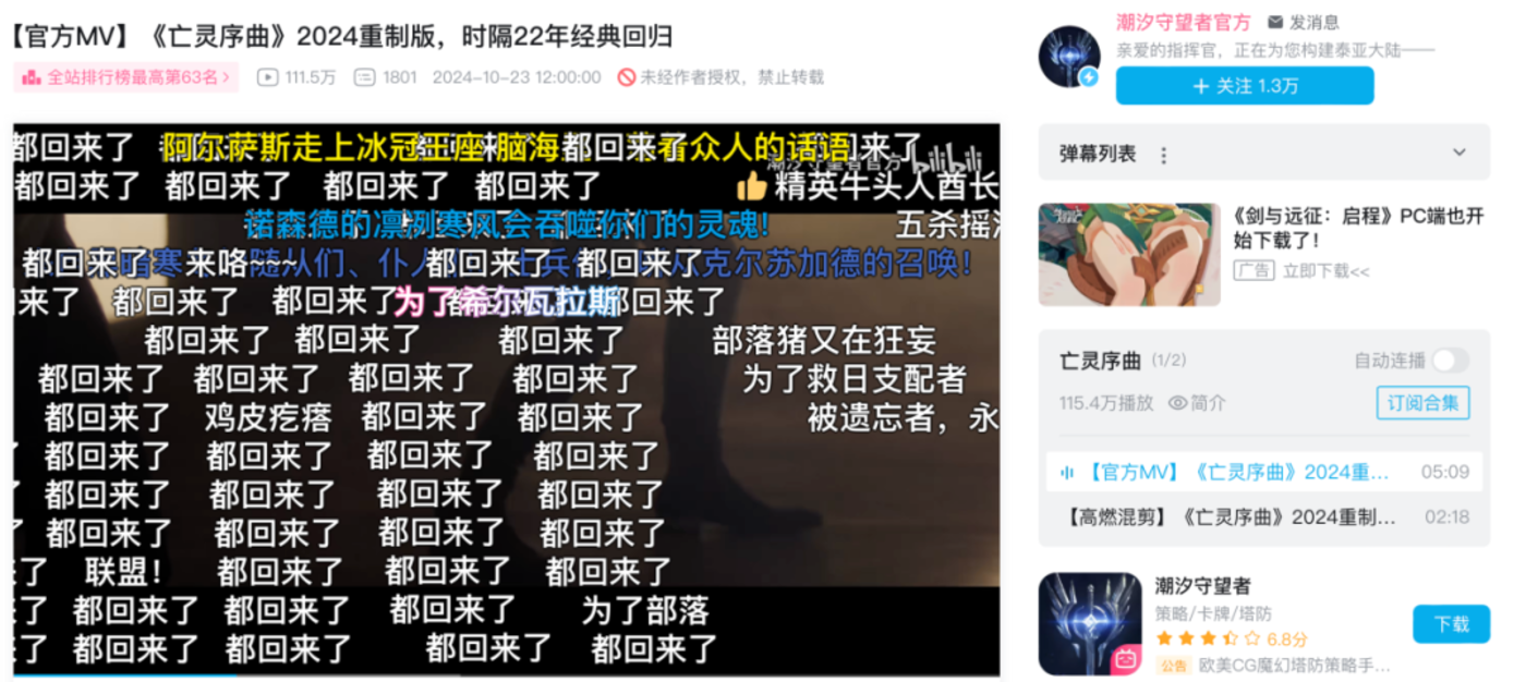 《潮汐守望者》制作了《亡灵序曲》2024重制版,并在B站平台收获超百万次的播放量。从玩家的评论中可以看到,该视频主要受众是《魔兽争霸3》玩家,而且纷纷表示“都回来了”、“为了部落”、“为了联盟”等。