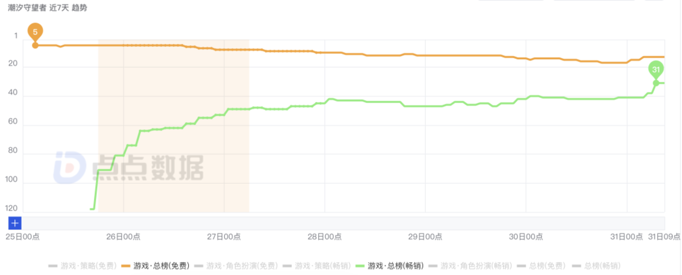 点点数据显示,《潮汐守望者》上线当天位居iOS游戏免费榜第五,并且截至10月31日仍保持在TOP15以内。在iOS畅销榜中,《潮汐守望者》保持不错的态势,最高排名第31名。