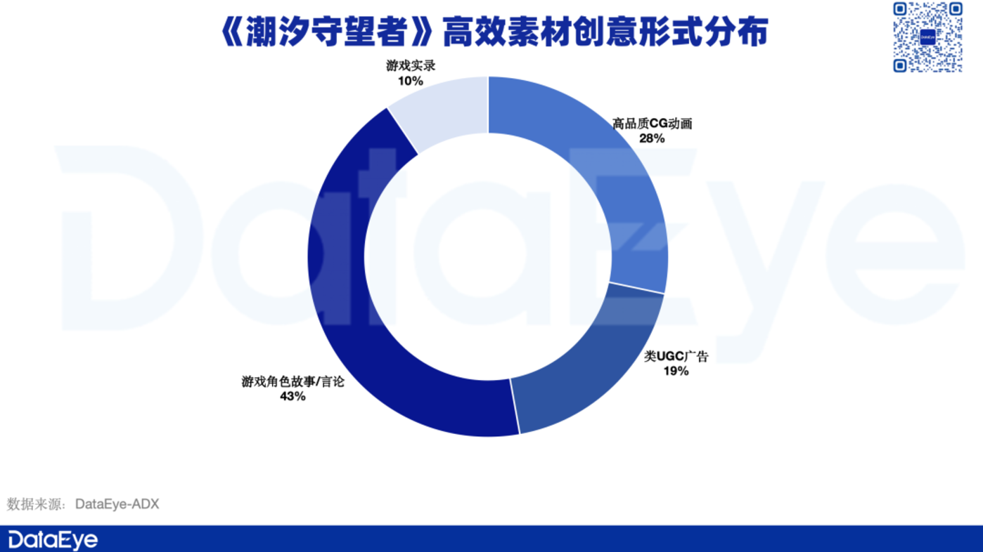 DataEye-ADX数据显示,《潮汐守望者》曝光量TOP50的高效素材,其投放素材创意形式中,游戏角色故事/言论素材占比较高,约为43%,其次则是高品质CG动画素材,占比约为28%。