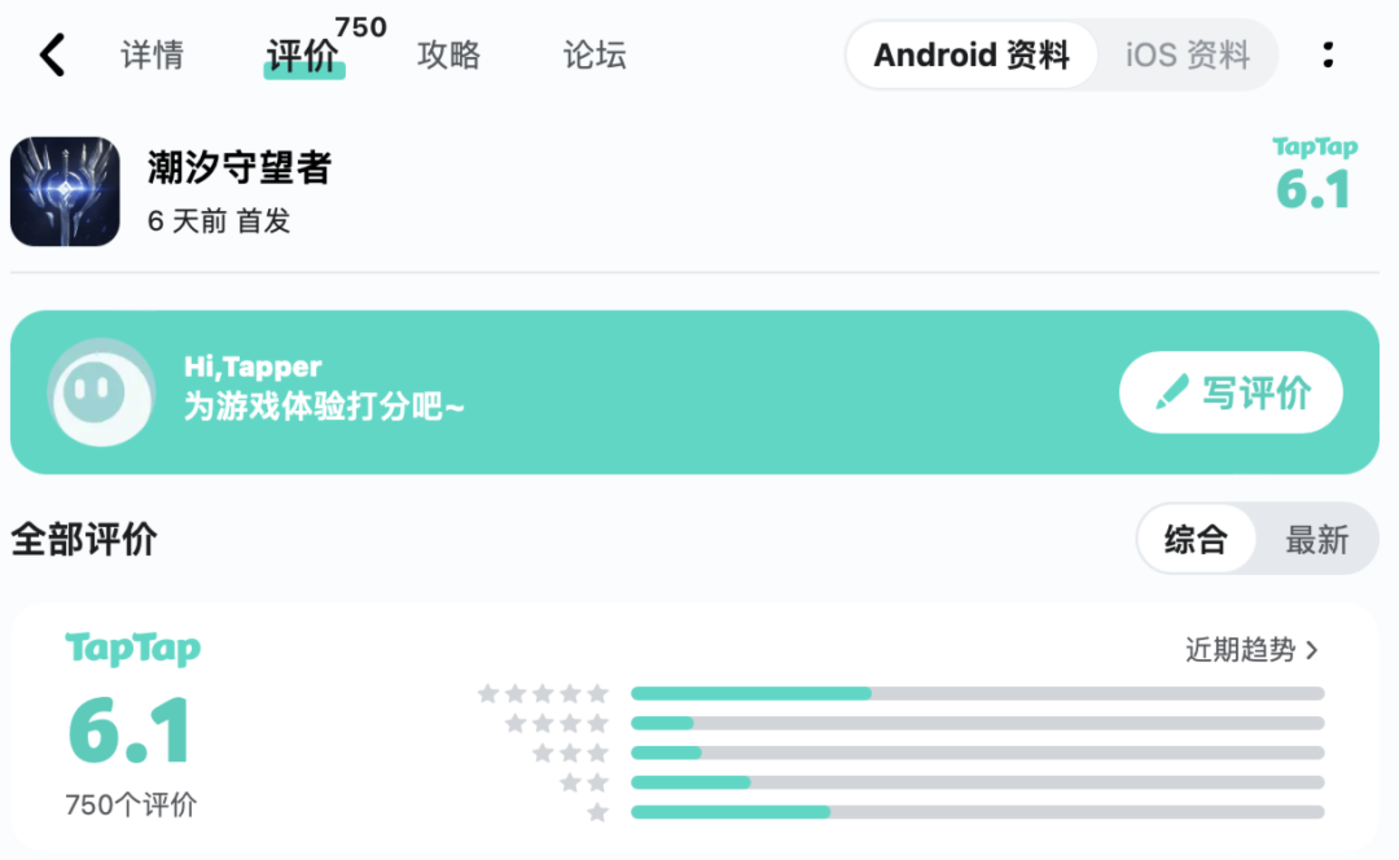 用户口碑方面,截至10月31日,《潮汐守望者》TapTap评分为6.1分。