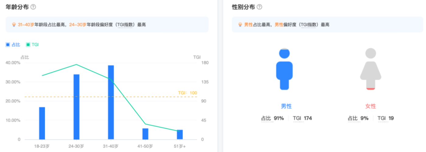从抖音用户画像来看,中年男性玩家为主。巨量算数数据显示,关键词“潮汐守望者”用户分布明显,其中24-30岁用户占比约为33.98%,而31-40岁的用户占比大约为38.51%。性别分布数据显示,男性玩家占比为91%。
