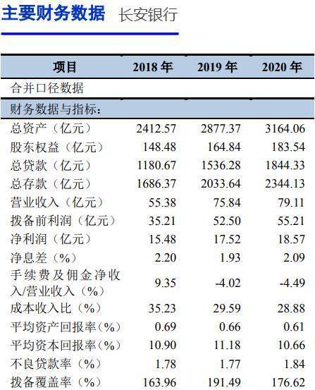 截至2020年末,长安银行合并口径经审计的资产总额为3164.06亿元,总存款和总贷款分别为2344.13亿元和1844.33亿元,不良贷款率为1.84%,资本充足率为11.57%,核心一级资本充足率为8.82%。2020年,长安银行实现营业收入79.11亿元、拨备前利润55.21亿元、净利润18.57亿元。