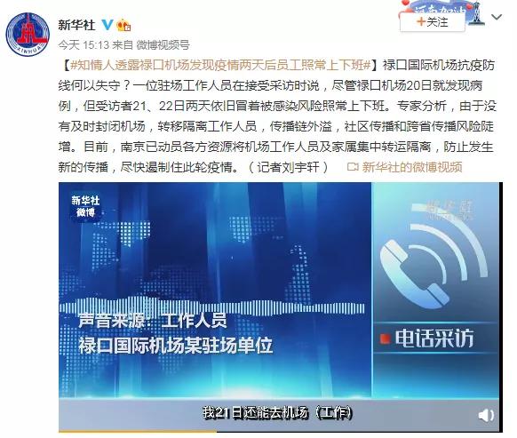 新华社7月31日报道,关于“禄口国际机场抗疫防线何以失守”这一问题,一位驻场工作人员在接受采访时说,尽管禄口机场20日就发现病例,但受访者21、22日两天依旧冒着被感染风险照常上下班。专家分析,由于没有及时封闭机场,转移隔离工作人员,传播链外溢,社区传播和跨省传播风险陡增。目前,南京已动员各方资源将机场工作人员及家属集中转运隔离,防止发生新的传播,尽快遏制住此轮疫情。