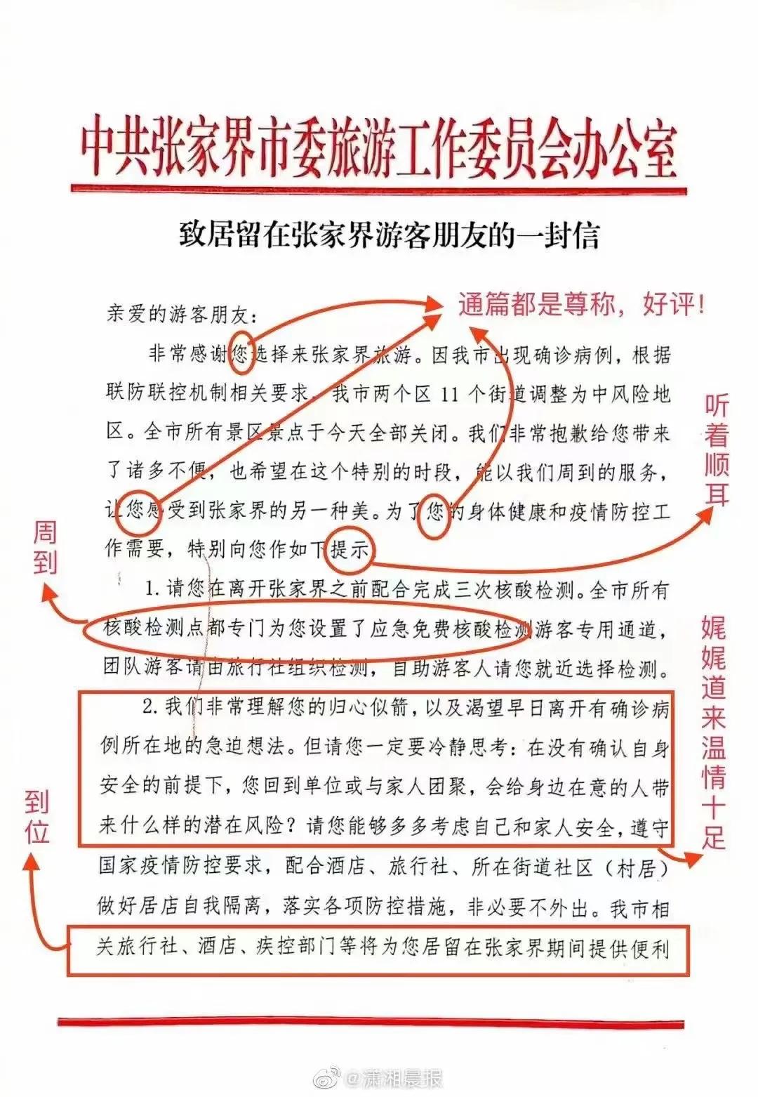 30日下午,中共张家界市委旅游工作委员会办公室发布的《致居留在张家界游客朋友的一封信》开始在网上热传,网友纷纷给张家界点赞。有网友在信中批注了一些文字细节。