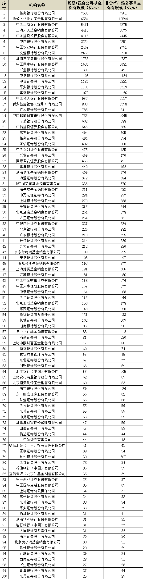 再看看股票+混合公募基金保有规模,也就是权益类基金的保有量规模排名。招商银行以7535亿元排名榜首,相比一季度又增加了824亿元;蚂蚁基金以6584亿元排在第二位,工商银行以5471亿元位列第三。值得一提的是,天天基金不仅非货基保有规模一举超过了5000亿元、从第五名上升至第四名,权益类基金保有量也以4415亿元排在了第四位,相比一季度增加了665亿元。此外还有建设银行(601939,股吧)、农业银行(601288,股吧)、交通银行(601328,股吧)等11家代销机构的权益类基金保有规模也超过千亿元。