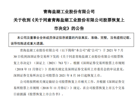 7月30日晚间,*ST盐湖公告称,公司当日收到深圳证券交易所下发的《关于同意青海盐湖工业股份有限公司股票恢复上市的决定》,根据《上市规则》的相关规定及深交所上市委员会的审议意见,深交所决定公司股票自2021年8月10日起恢复上市。