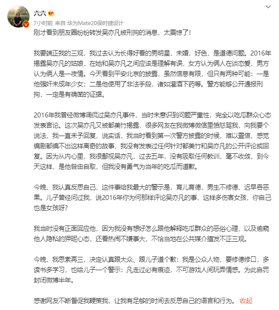 事件发生后,著名编剧六六发微博道歉说:我要端正我的三观,我过去认为长得好看的男明星,未婚,好色,是道德问题。2016年我曾经微博调侃过吴亦凡事件,当时未意识到问题严重性,完全以吃瓜群众心态发表言论……今晚,我思索再三,决定认真跟大众、跟儿子道个歉:我是公众人物,要修德修口,多读书多学习,也给儿子一个警示:凡走过必有痕迹,不可游戏人间玩弄情感。为此自罚封闭微博半年。