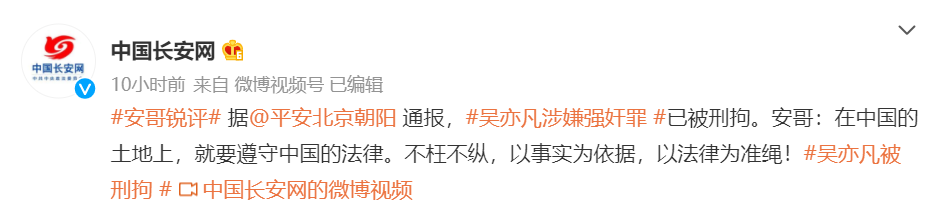 7月31日晚间,北京朝阳警方再次通报,吴亦凡涉嫌强奸被刑拘。