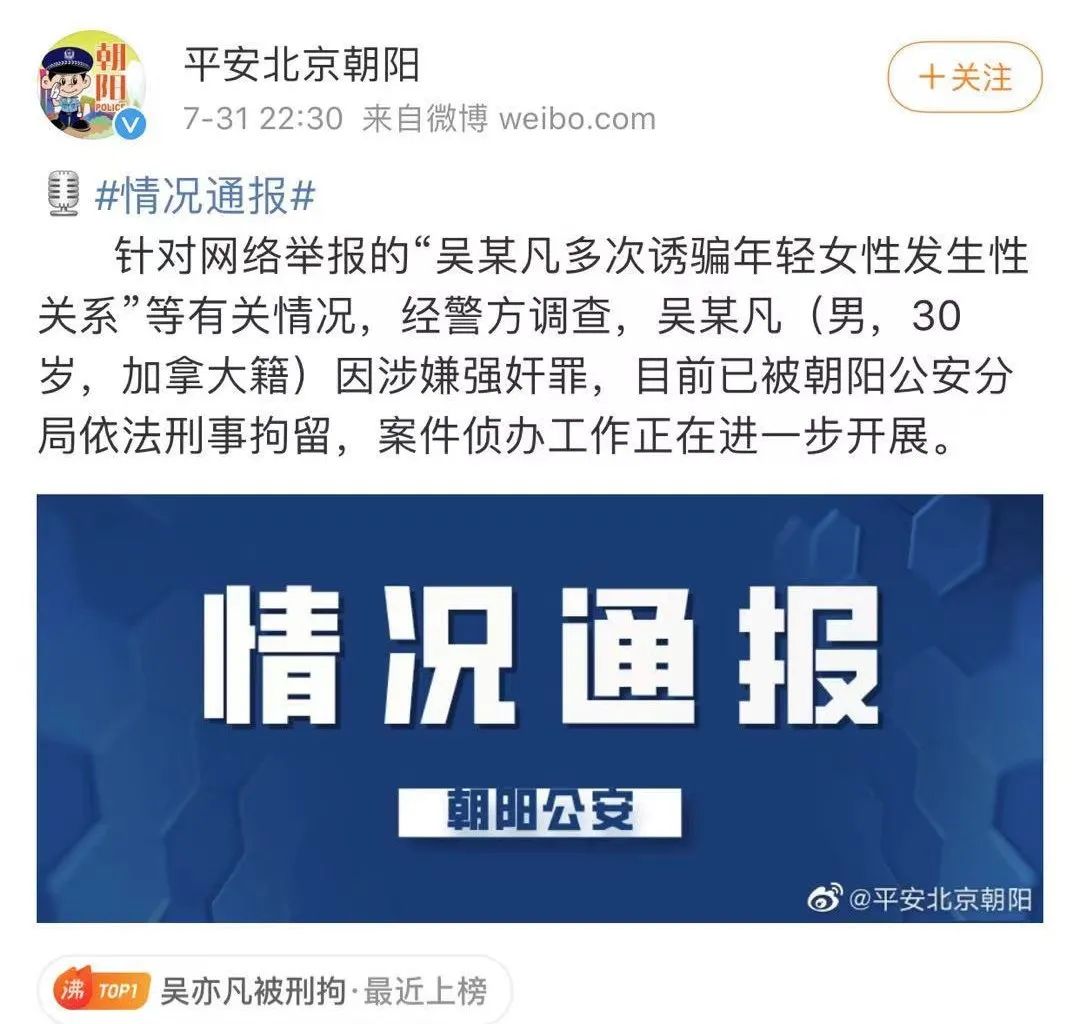 7月31日晚间, “平安北京朝阳”微博号发布情况通报:针对网络举报的“吴某凡多次诱骗年轻女性发生性关系”等有关情况,经警方调查,吴某凡(男,30岁,加拿大籍)因涉嫌强奸罪,目前已被朝阳公安分局依法刑事拘留,案件侦办工作正在进一步开展。