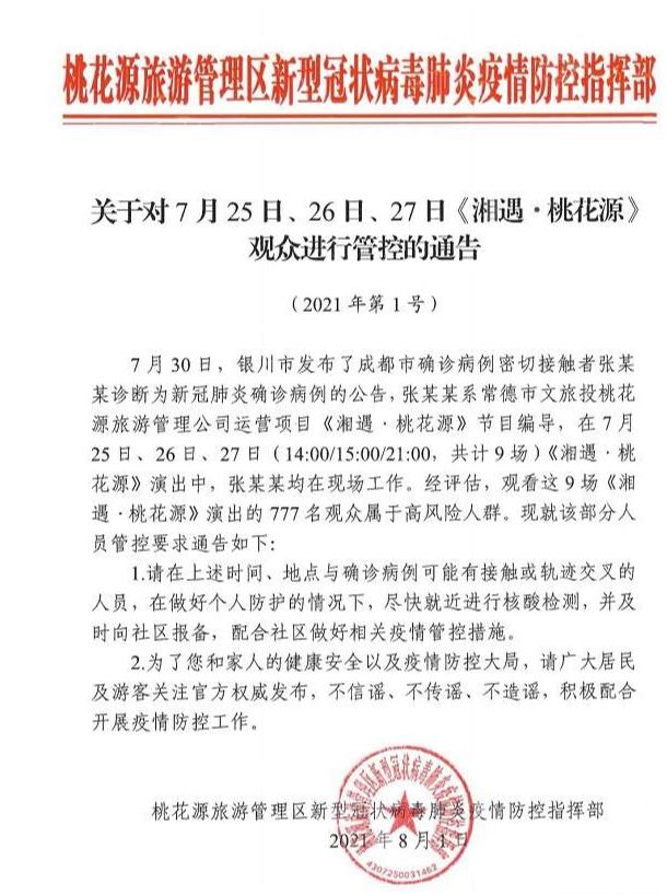 原标题:湖南常德桃花源景区9场演出777名观众高风险,尽快做核酸检测并及时向社区报备
