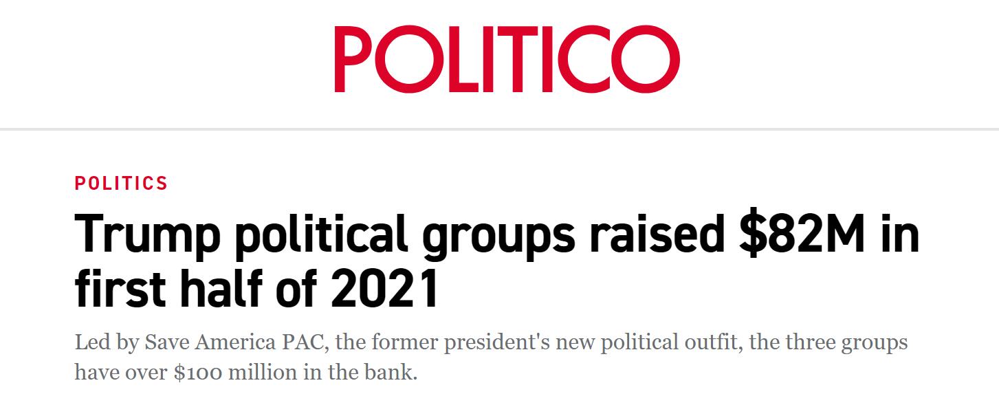 “这种情况也是前所未有的,”报道称,历史上从未有一位前总统将9位数的政治捐款存入银行,以支持一项政治行动。“政客”网站还比较说,特朗普政治委员会筹集的资金,几乎和共和党全国委员会筹集的一样多。
