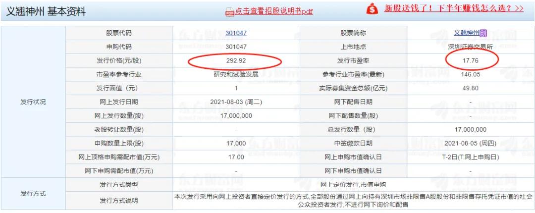 8月3日,周二发行的创业板注册制新股义翘神州,发行价达到了A股是史上最高的292.92元。由于热门的医疗概念,以及高发行价,义翘神州中一签或有很高的收益,一签500股的金额为14.65万元。如果上市首日大涨103%的话即赚超15万,涨69%的话即可一签赚10万。这几年,医疗股牛股辈出。