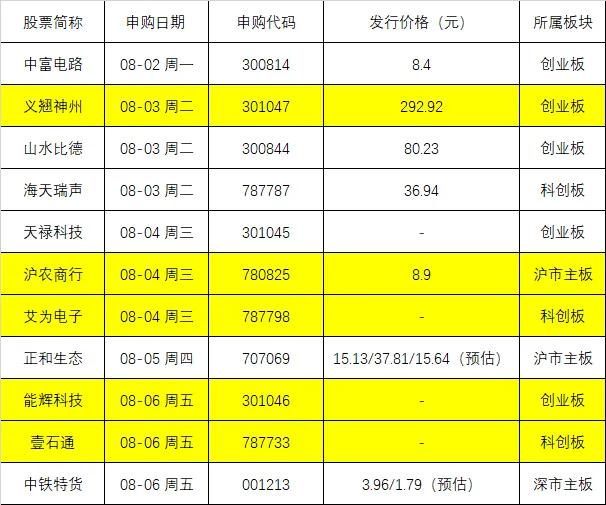 此外,还有多个热门赛道股,如8月4日周三发行的芯片股艾为电子,8月6日周五发行的锂电股壹石通、光伏股能辉科技;以及8月4日周三发行的容易中签的银行股沪农商行。