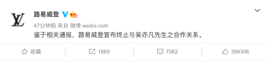7月22日晚,北京市公安局朝阳分局通报吴亦凡事件调查结果,通报了关于吴某凡与都某竹交往情况,次日,路易威登品牌通过官方微博宣布终止与吴亦凡的合作关系。