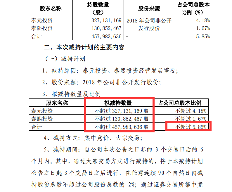 8月1日晚间,工程机械龙头徐工机械(000425,SZ)公告称,公司股东泰元投资、泰熙投资的普通合伙人均为杭州新俊逸股权投资管理有限公司,构成一致行动人关系,目前合计持有公司股份457,983,636股,持股比例为5.85%。泰元投资、泰熙投资计划6个月内,通过集中竞价、大宗交易方式减持公司股份合计不超过457,983,636股,不超过公司股份总数的5.85%(按照最新收盘价估算,这部分市值约26.7亿元)。其中:通过大宗交易方式进行减持的,在任意连续90个自然日内减持股份总数不超过公司股份总数的2%;通过集中竞价交易方式进行减持的,在任意连续90个自然日内减持股份总数不超过公司股份总数的1%。