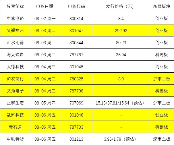 此外,还有多个热门赛道股,如8月4日周三发行的芯片股艾为电子,8月6日周五发行的锂电股壹石通、光伏股能辉科技;以及8月4日周三发行的容易中签的银行股沪农商行。
